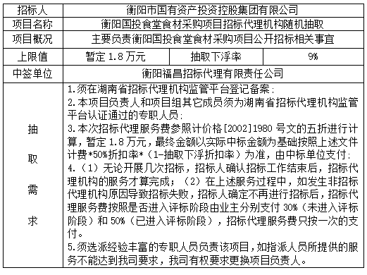 衡陽國投食堂食材采購項目招標代理機構(gòu)隨機抽取結(jié)果公示